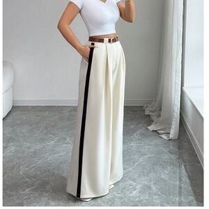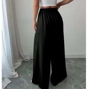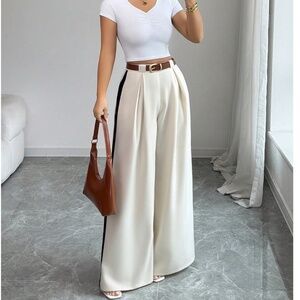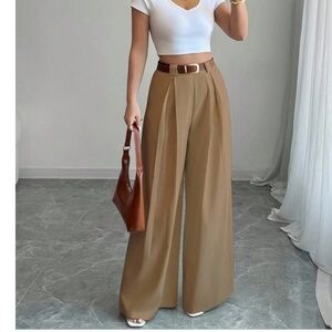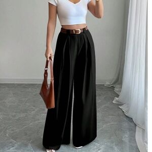 Classic Solid Stretchy Waist Pleated Pockets Wide leg Trouser Pants