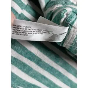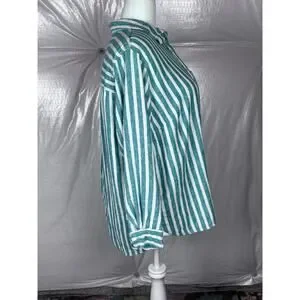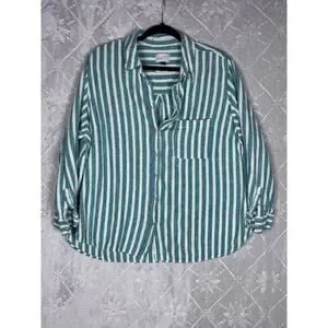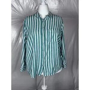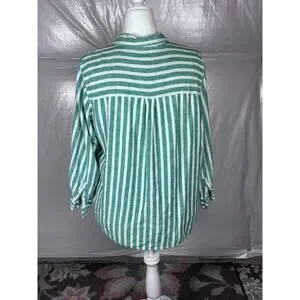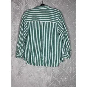 Universal Thread women’s button down shirt in size XXL. Relaxed fit with soft + breathable linen-blend fabric. Features vertical green and white stripes, full button front, chest pocket, and roll-tab sleeve styling. Perfect for layering and everyday wear.