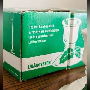 Vintage pair of Lillian Vernon Christmas Holly Berries ceramic candle stick holders. Cream colored with little green leaves and red holly berries. In good condition, no cracks or chips, still very glossy. Comes with original boxes… although the boxes do have some surface wear.