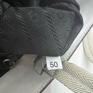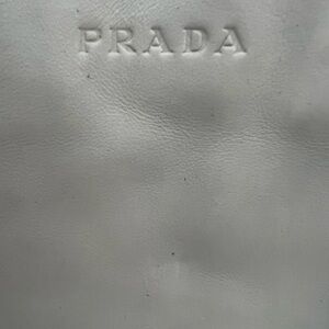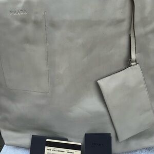 Large Lavanda color (stone) Prada tote. Tote is in excellent condition with minor wear. Inside is perfect. This tote is perfect for work or play and is big enough to handle work you may need to throw in it. Inside has separate zip compartments and a cell phone pocket. Comes with a detachable pouch and original cards.