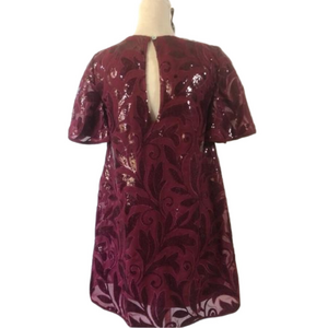 Elegant burgundy dress with shimmering sequins. Short sleeves and a relaxed fit. Perfect for special occasions.