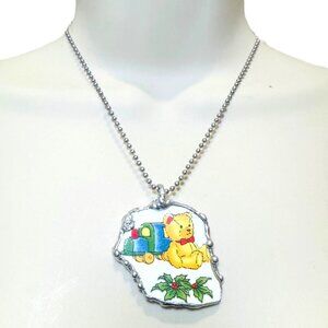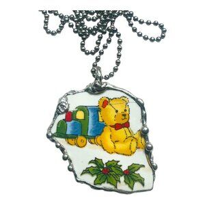 In the heart of this whimsical necklace lies a story of childhood wonder and festive joy. Crafted from vintage broken china, it features a charming teddy bear on a train, surrounded by holly. A silver-tone chain completes this nostalgic piece, evoking memories of holiday warmth and timeless innocence.