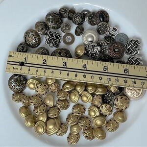 • Vintage Metal Button Assortment (86 pcs) – Gold & silver tones, various sizes, includes decorative and embossed styles.