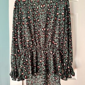 leopard print blouse • tie front top • animal print shirt • boho chic top • flowy blouse • Spin top • ruffle sleeve blouse • night out top • trendy fall blouse • multiprint top • chic feminine blouse • lightweight v-neck blouse • workwear blouse