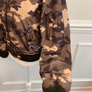 Gap bomber jacket. Camo design with green, gray and tan colors. Orange liner. Zips up in front. Two snap pockets on sides, hidden snap pocket inside jacket and a zip pocket on sleeve. Pit to pit is approximately 22 inches. Length is approximately 23 inches. Comfortable material.