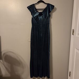 The Alexa B Nites Women's Forest Green Velvet Cocktail Party Formal Dress in size 12 is a stunning and elegant garment perfect for various formal occasions such as weddings, parties, or even a night out in the city. The sleeveless, off-the-shoulder design with a zipper closure and long length exudes sophistication and style. Made from luxurious polyester velvet fabric, this dress is sure to make a statement and turn heads wherever you go. Whether you're looking for a sexy and glamorous look for a special event or a more bohemian and festive ensemble for the holidays, this dress by Alexa B Nites is a versatile choice for any season.