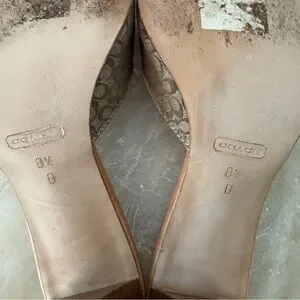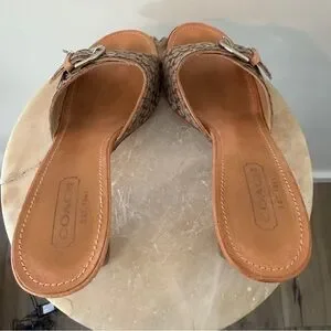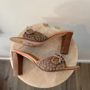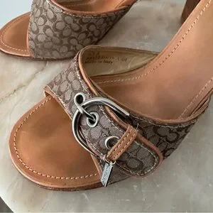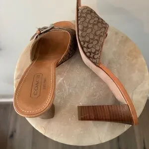 These beautiful Italian made Coach Signature Daryn heels are made from leather and feature adjustable buckle straps. These are in size 8 1/2. Vintage pair! Silver hardware includes mini Coach hangtags. Wonderful condition considering age