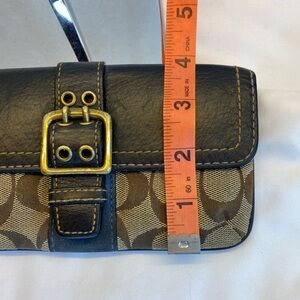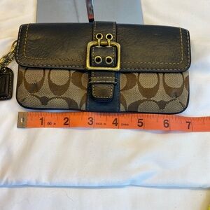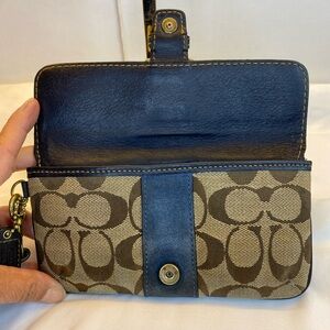 This is a very nice wristlet with canvas signature C and studded strap. Gold color hardware. Comes with special Edition Fall 2004 hangtag. Brown leather and blue suede as well. Clean considering it’s a 2004. Corners are good, no tears or holes. Please see all pictures for condition and approximate measurements.