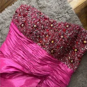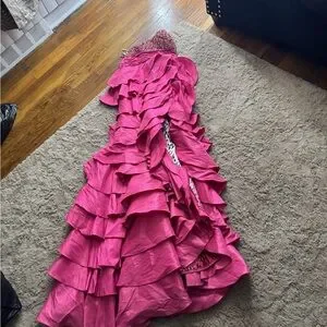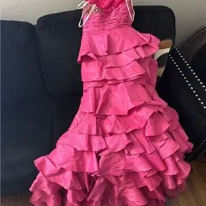 Stunning pink prom dress by Tony Bowls. Features a strapless design with ruffled layers. Eye-catching leopard print accents. Worn once beautiful dress