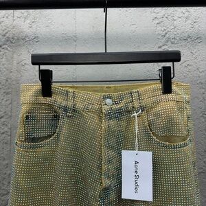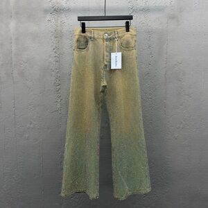 Bold flare jeans with a unique green and yellow pattern. Perfect for a standout look.