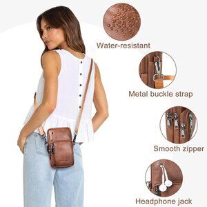 Features: A small yet spacious crossbody bag measuring 6.8" x 4" x 1.8" — fits your phone, cards, cash, keys, and lip balm. Adjustable strap with sturdy metal buckle, versatile for over-the-shoulder or crossbody wear. Crafted from durable, water-resistant PU leather, it’s ideal for light rain or splashes. Features a smooth zipper and built-in headphone jack, great for traveling and everyday errands.