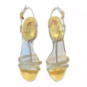 Michael Kors Yvonne Platform Gold Heels Size 9.5 Women’s Strappy Glitter Formal