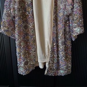 Vibrant sequin cardigan with open front. Adds a touch of glam to any look.