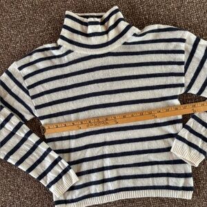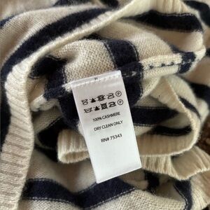 Super soft pullover in 100% pure cashmere. Deep midnight blue stripes on cream. In excellent condition…gently laundered in natural, chemical free detergent, then laid to dry. Tagged as a large, but seems smaller to me. Definitely not shrunken at all…just a slimmer fit.