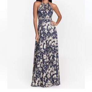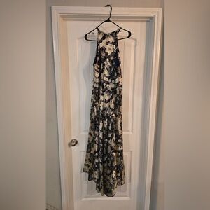 Betsy & Adam Petite Floral Halter Neck Gown size 14 EUC navy gold floral