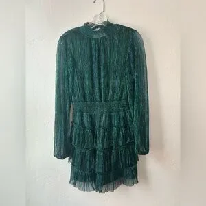 Elegant emerald dress with long sleeves. Features a tiered skirt and shimmering fabric.