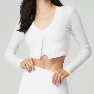 Stylish white ribbed cropped cardigan with matching shorts. Perfect for a chic look.