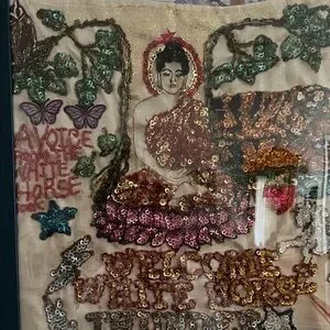 This stunning handcrafted for home or office. A unique art piece features a sequin-embellished Buddha design, beautifully framed in navy blue. Perfect for adding a touch of elegance and spirituality to any room.