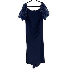 Blue full length gown from Xscape. Blue fitting center with big puffy floral sleeves. Has a bustle that can be pulled up with a button in the back. Bottom has no hem. Has gripping material around the bust so theres no slipping. Has ribbing in the chest to keep form. Used but in great condition, ready to be worn again!