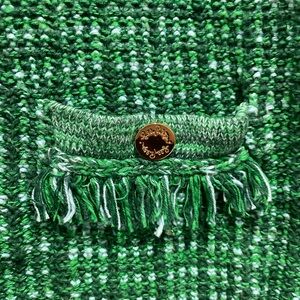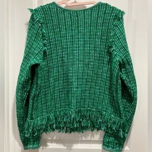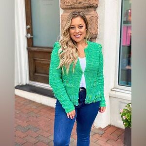 Chic green tweed jacket. Fringe details on edges. Perfect for layering.