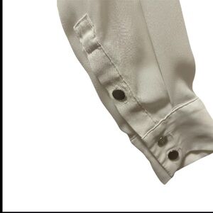 Cream blouse with a sleek classic design. Ideal for versatile styling. Collared, button down. Nice buttons at the wrist. Semi-sheer.