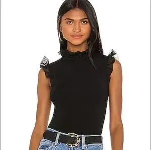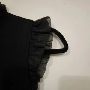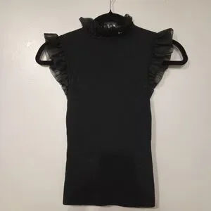 This elegant black top features stylish ruffle sleeves, perfect for any occasion. Its sleek design offers a sophisticated look.