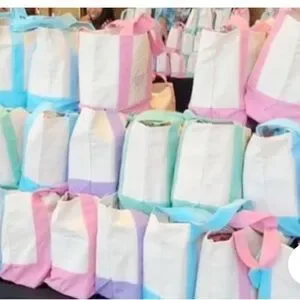 Charming mini canvas tote bag from Trader Joe's. Features a pastel blue and cream design. Perfect for small errands or as a stylish accessory.Stylish tote bags in pastel colors. Perfect for everyday use.