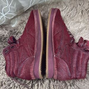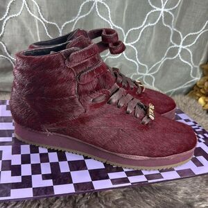 (A) RARE Reebok Amber Rose Muva Fuka Burgundy Gum Top Sneakers, Women's Size 9 Classic Reebok sneakers with a touch of extra flair and style. Made from pony hair and leather. Small platform, velcro strap around the ankle and laces in the front. Condition: Used, lightly used, in good condition see photo for more details