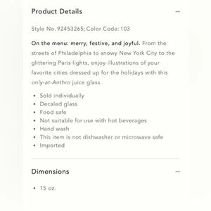 Anthropologie Holiday In The City Juice Glass - ROME • Exclusively at Anthropologie • Mouth-blown glass • Not suitable for hot beverages • Hand wash • Imported • Dimension: 15 oz