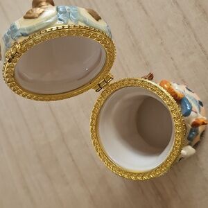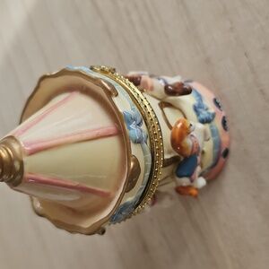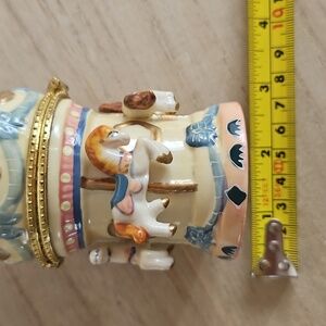 Adorable ceramic trinket box with four horses on a carousel. in great condition other than some of the gold paint wearing off the top. Measurements in photos.