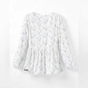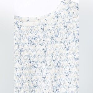 Stylish smocked top with blue floral accents. Soft and comfortable fabric.