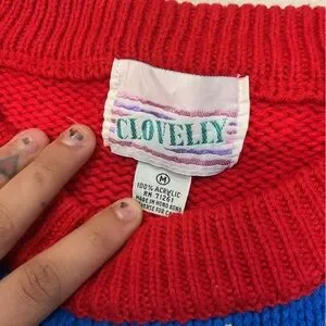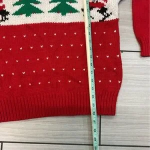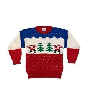 Classic 90s holiday knit featuring playful Santa-clause , green trees, and a bold red/blue/white colorblock design. Cozy and festive for the season. In good condition.
