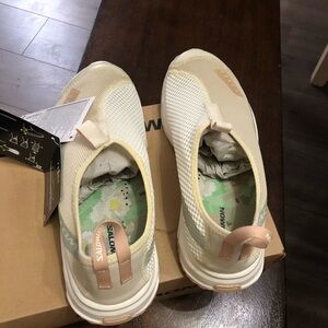 Brand new in box. Cream/Light Green with peach accents. Really nice pair. Ships fast. Retail was $110. Salomon slip-on sneakers in light tan. Easy to wear and versatile.