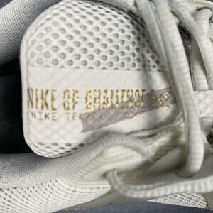 Color: white and light gray with metallic gold accents and large Swoosh logos.