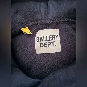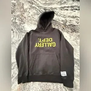 Charcoal hoodie featuring bold yellow Gallery Dept print. Comfortable and stylish for everyday wear.