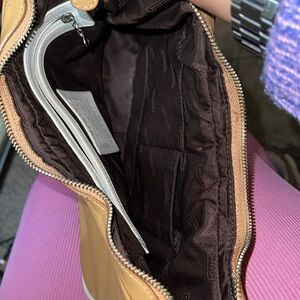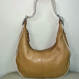 Classic Coach leather hobo featuring soft tan leather with cream piping, a slouchy silhouette, and a wide comfortable shoulder strap. Zip-top closure, roomy interior, and timeless Coach quality. Perfect everyday neutral that pairs with any outfit.