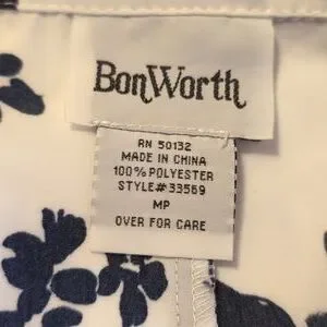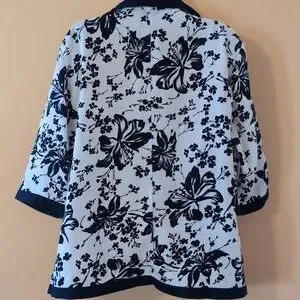 Stylish Bon Worth navy and white floral short duster. Perfect for any occasion. Great for the office. Size MP. 100% polyester. Machine washable. The garment measures 24" in length.
