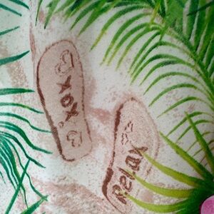 This fun and flirty Betsey Johnson dress is perfect for your next beach getaway or summer occasion! Featuring a vibrant tropical print with palm fronds, pink hibiscus-like flowers, and subtle script overlays that say "BEACH," "RELAX," and "TROPICAL," this piece captures a playful, vacation-ready vibe.