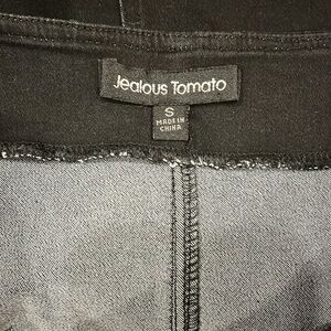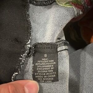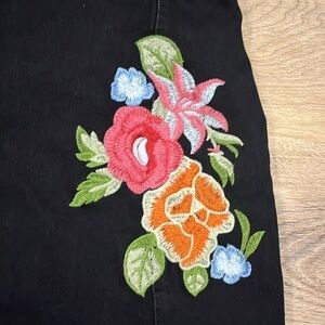 Beautiful Embroidered Floral Black Mini Skirt Faux Button size Small. Stretchy material. 13.5” across waist, 16” length.