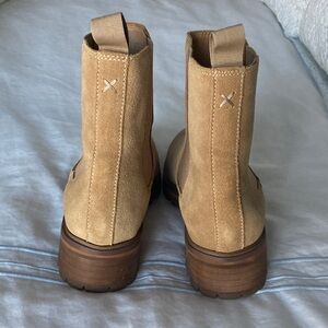 Perfect suede ankle boots. 100% leather upper and lining. Durable rubber sole. Versatile style and color. Currently sold out online! I received as a gift, wore only once. Love the boots but the color just isn’t for me. They’ve also been waterproofed with a natural suede protectant!
