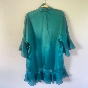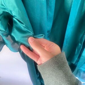 Green and teal satin finish short robe with lace details. Tie comes with the robe.