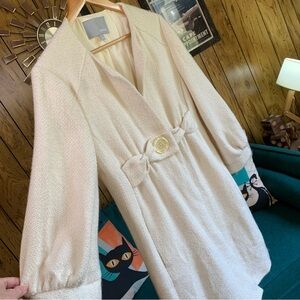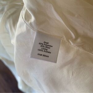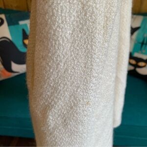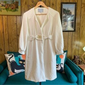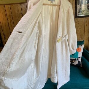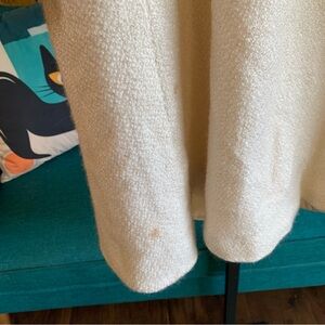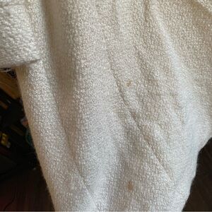 Nice lighter weight coat - cream colored textured tweed / boúcle style fabric. Fully lined. No collar. No pockets. Dressy style. There are several rust color stains on coat - see pics. In otherwise good condition.
