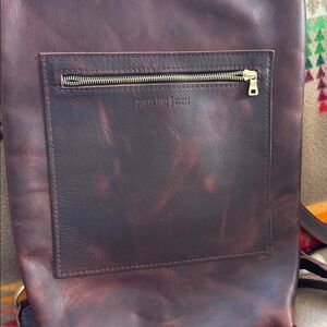 Mottled dark brown leather laptop backpack by Portland Leather. Features a front zip pocket, interior pocket, zipper top, and adjustable straps. Lava color; top 13”; 10” bottom; height 15; 3” depth ; like new!