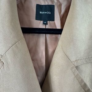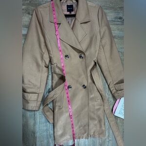 Sophisticated trench coat with double-breasted design. Features a stylish belt for a tailored look. Ideal for versatile wear.