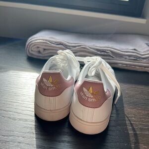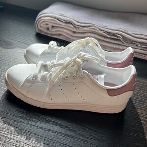 Worn one time! Adidas Stan Smith Court sneakers with lilac accent color. Size 8US. These tend to run large. I normally wear a size 8.5-9 in sneakers.