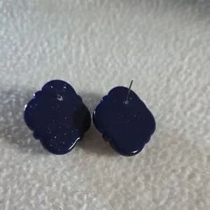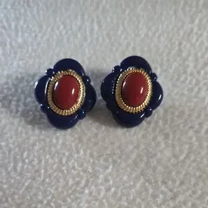 Add a touch of elegance with these chic earrings featuring a vibrant red center and deep blue frame. Perfect for any occasion. One of the posts is a little wiggly.