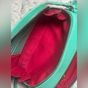 🩵Dooney & Bourke Sawyer double zip camera crossbody & zip around wallet SET Mint Green Saffiano, 8"L x 5.25"H x 3"D, 26" strap drop length, double compartment design with double top zip closure, exterior back slip pocket, 4 credit card slots, 1 zip pocket, 1 slip pocket, gold tone hardware, this is an everyday crossbody and easy to wipe clean. Ink stain inside bag. A couple of small areas on bottom but nothing noticeable. Light hardware scratches. Well maintained. See photos.