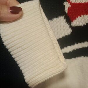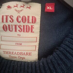 It is also known as an "ugly Christmas sweater" and has the text "IT'S COLD OUTSIDE" on the collar.