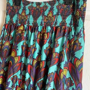 Vibrant strapless maxi dress with a bold pattern. Features a mix of teal, red, and purple colors.