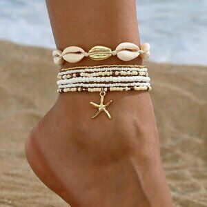 Shell Ankle Bracelet Set for Women Gold Plated Boho Bead Adjustable Anklet Gifts